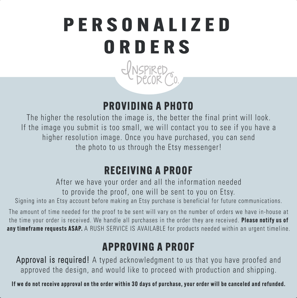 This is a perfect way to remember your First Dance! We do our best to make sure that each and every one of these custom prints is special just for you! The higher the resolution of the image, the better the print will be. While we do everything we can to make sure these look perfect, we can only do so much. If the image you submit is too small, we will contact you to see if you have a higher-resolution image.