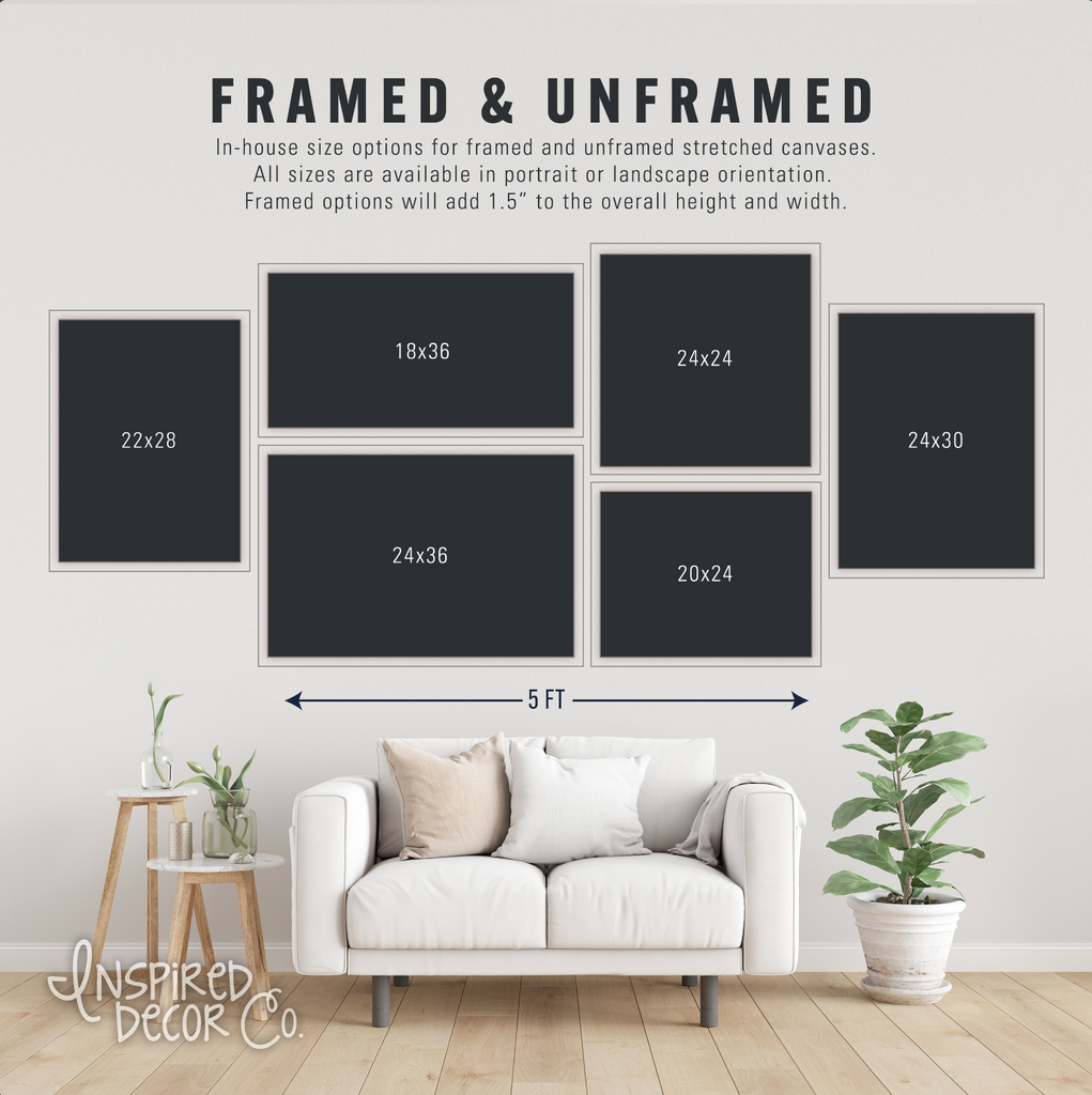 Not every space is built the same, and we want to make sure that we offer a size that will fit yours well! Some of the most popular sizes that we offer are 8x10, 9x12, 11x14, 12x12, 12x24, 16x20, 18x24, and 20x24. Our prints can be hung vertically or horizontally; please specify your preference in the personalization section of the order.