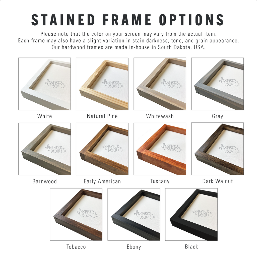 The sizes listed represent the printed area of each print. Our traditional canvases are 7/8” in depth. If you order a custom frame, it adds an extra 1.5” of height and 1.5” of width! The depth with our frames is 1.5”. We offer several different stain options for you to choose from: White, Natural Pine, Whitewash, Grey, Barnwood, Early American, Tuscany, Dark Walnut, Tobacco, Ebony, and Black.